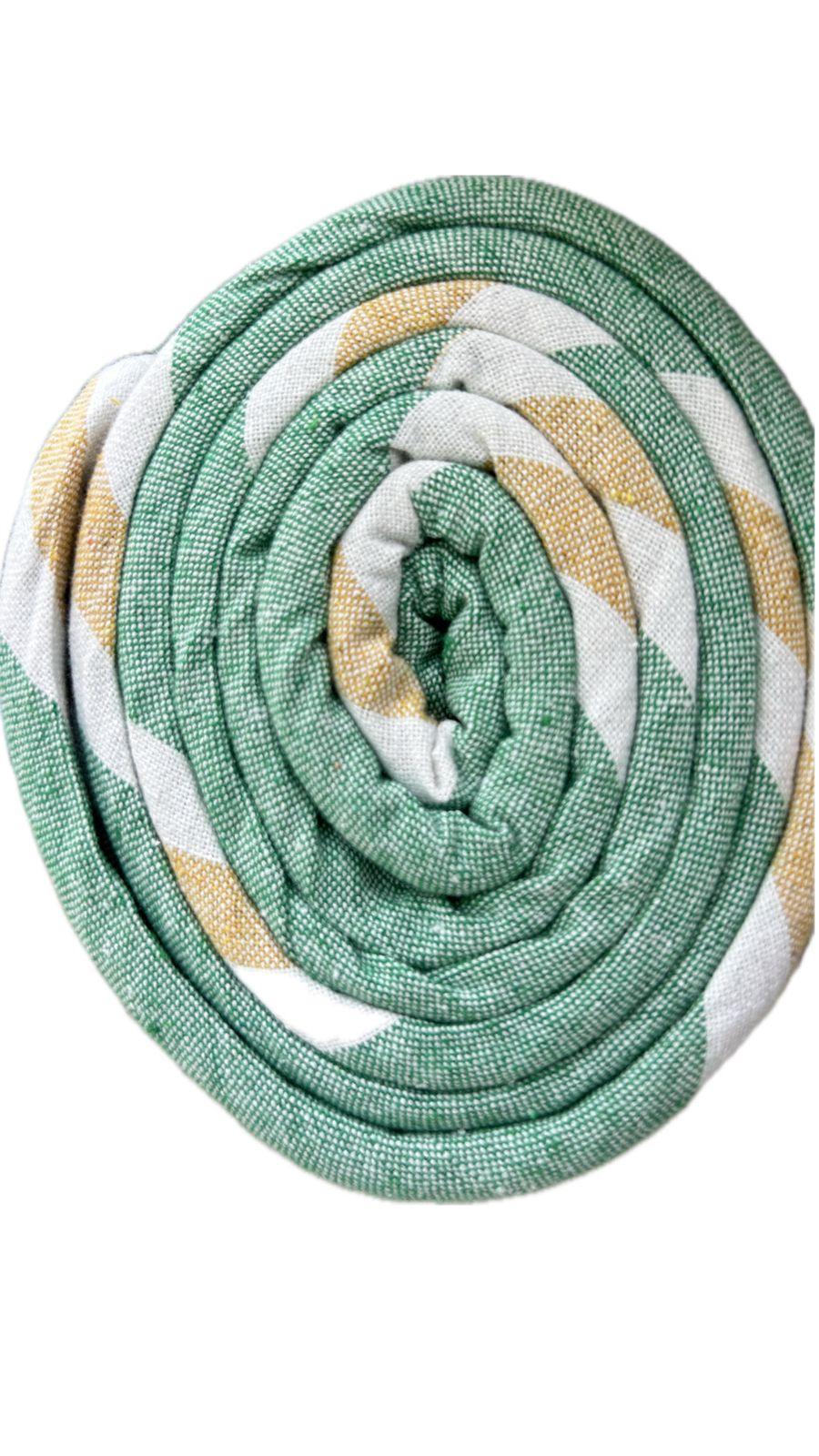 This Peshtemal features a striking and refreshing pattern: a beautiful blend of soft light green woven with crisp white and vibrant coral/orange-red stripes or zigzag accents. The intricate weave adds a subtle texture and artisanal quality, making it a stylish accessory wherever you go.