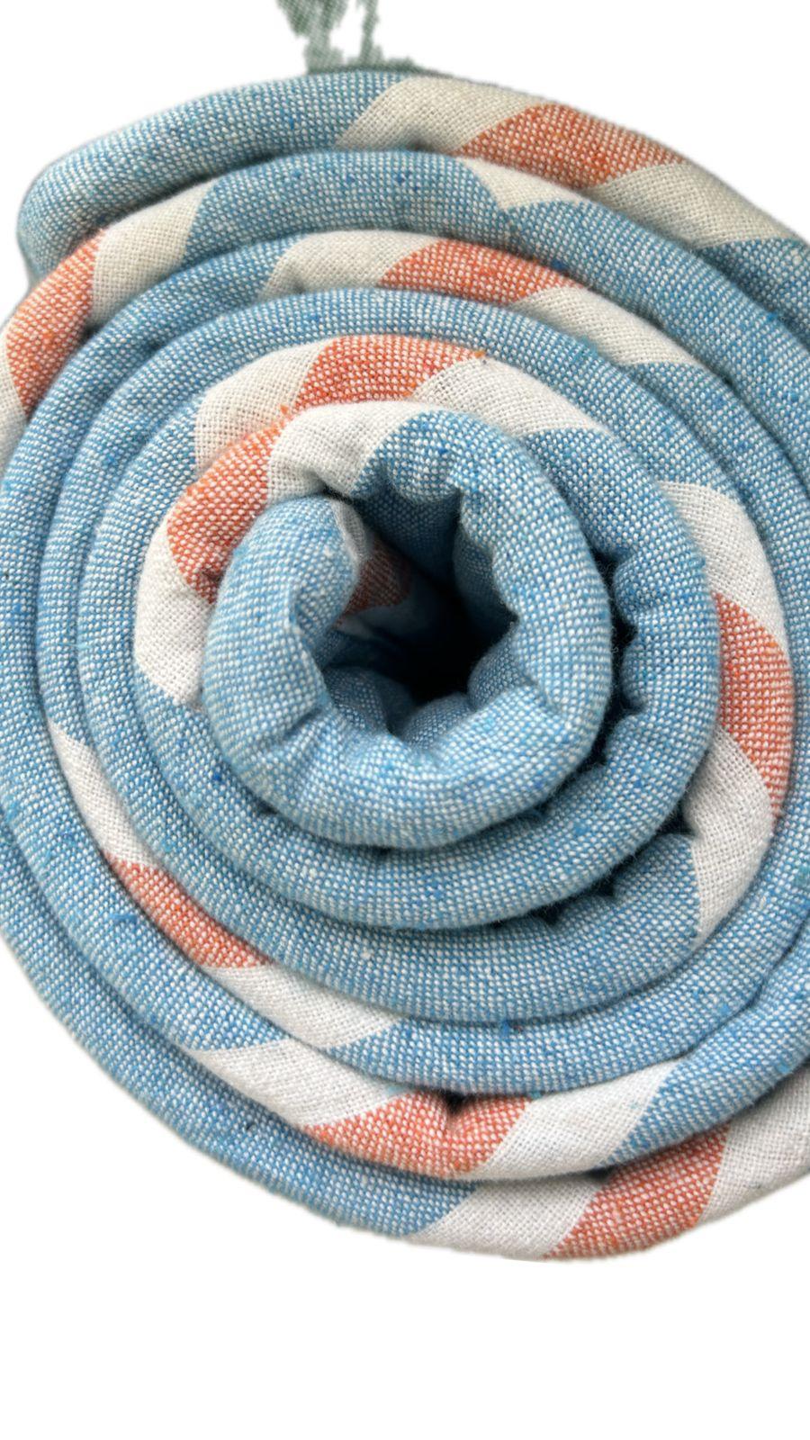 This Peshtemal features a striking and refreshing pattern: a beautiful blend of soft light Blue woven with crisp white and vibrant coral/orange-red stripes or zigzag accents. The intricate weave adds a subtle texture and artisanal quality, making it a stylish accessory wherever you go.