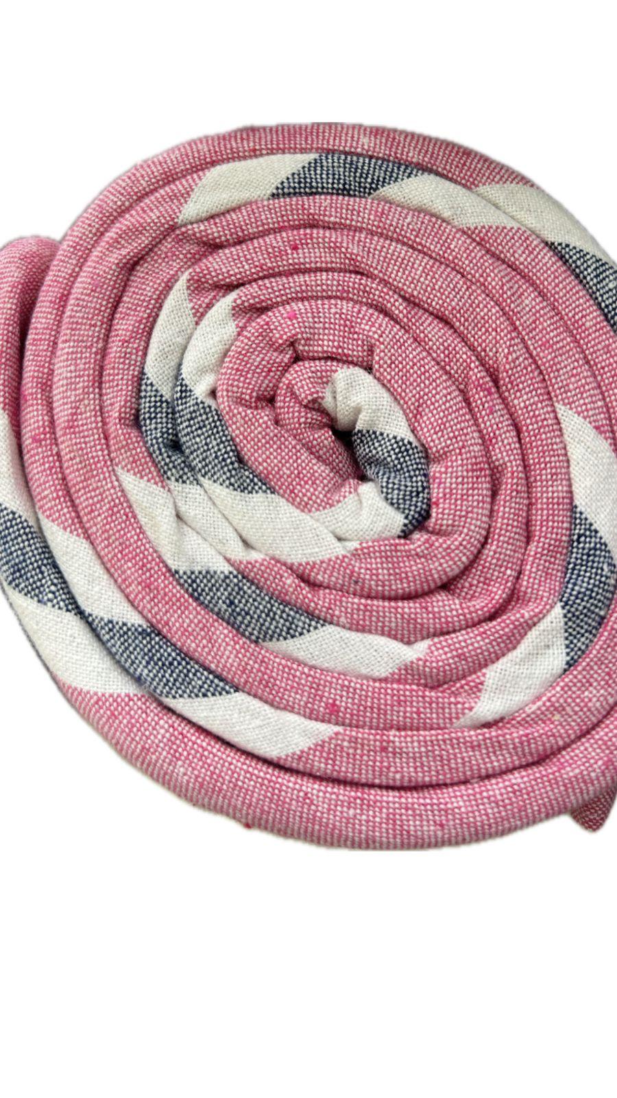 This Peshtemal features a striking and refreshing pattern: a beautiful blend of soft light pink woven with crisp grey and vibrant coral/orange-red stripes or zigzag accents. The intricate weave adds a subtle texture and artisanal quality, making it a stylish accessory wherever you go.